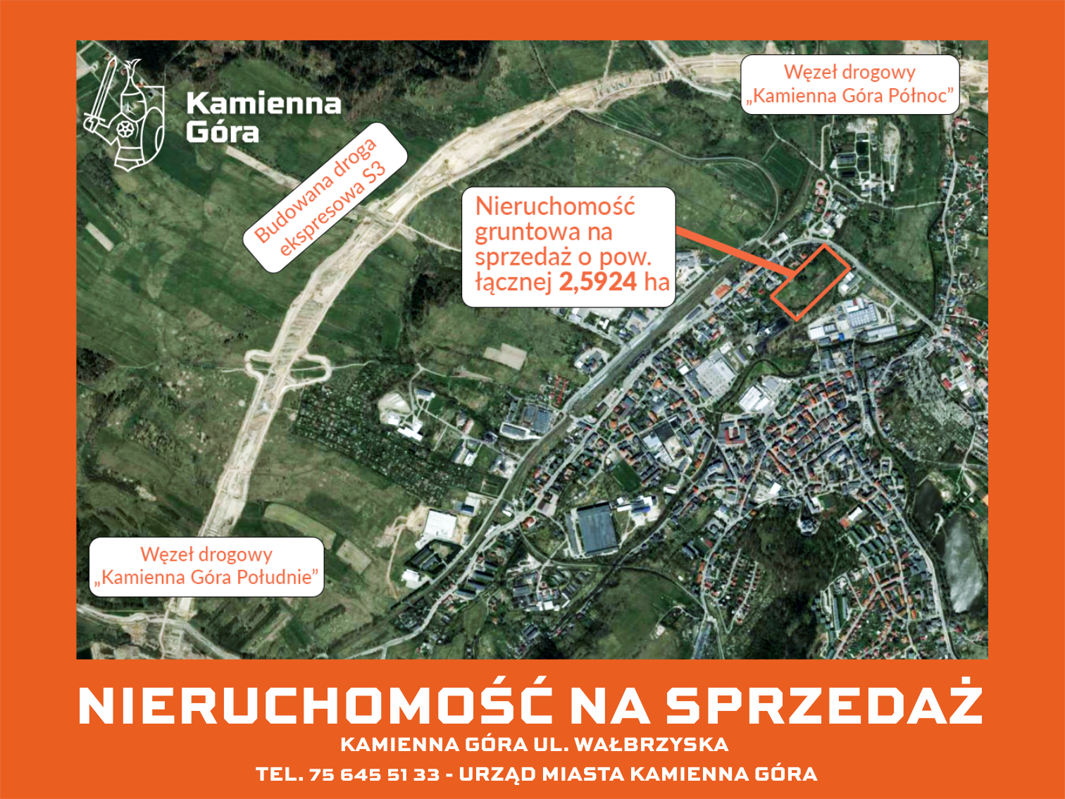 Przedmiotem przetargu jest nieruchomość gruntowa składająca się z działek nr: 58/1, 59, 60, 61, 62, 63/4, 64, 65, 95/1, 95/2, 115/3, 116/2, 117/1, 117/2, 117/3, 118/4, 119, 120, 121/1, 122/1, 123/1 i 125/6 o łącznej powierzchni 25 924 m2, położona w obrębie nr 3 miasta Kamienna Góra w okolicy ul. Wałbrzyskiej i Lipowej z przeznaczeniem pod obiekty handlowe o powierzchni sprzedaży większej niż 2000 m2.