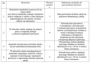 Zgodnie z art. 133 ust. 2 ustawy z dnia 14 grudnia 2016 r. Prawo oświatowe w postępowaniu rekrutacyjnym brane są pod uwagę kryteria określone przez Radę Miasta Kamienna Góra, którymi są: